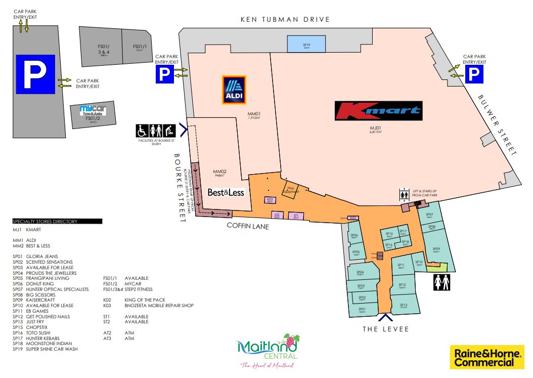 Maitland Central is anchored by Kmart, Best and Less and Aldi, the Centre has direct access to the main street pedestrian mall "The Levee".