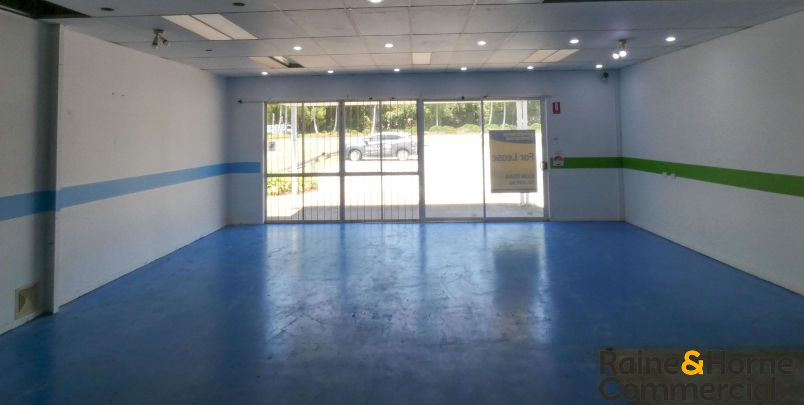 * Front showroom/display area with suspended ceiling and lighting
