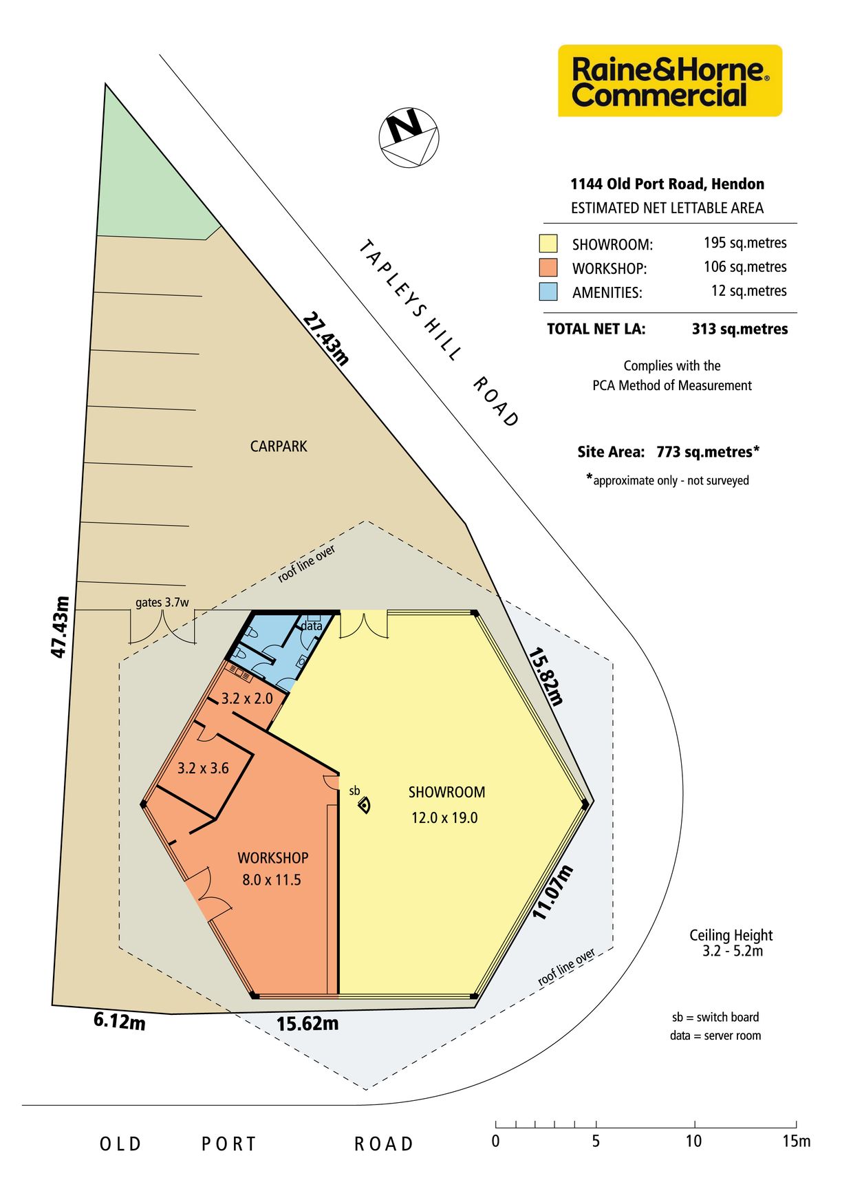 The property comprises open plan showroom, display area of approx. 195 m2 and workshop area with kitchen and amenities of approx. 106m2. There are separate male and female amenities and ample car parking with access from both Old Port Road and Tapleys Hill Road.